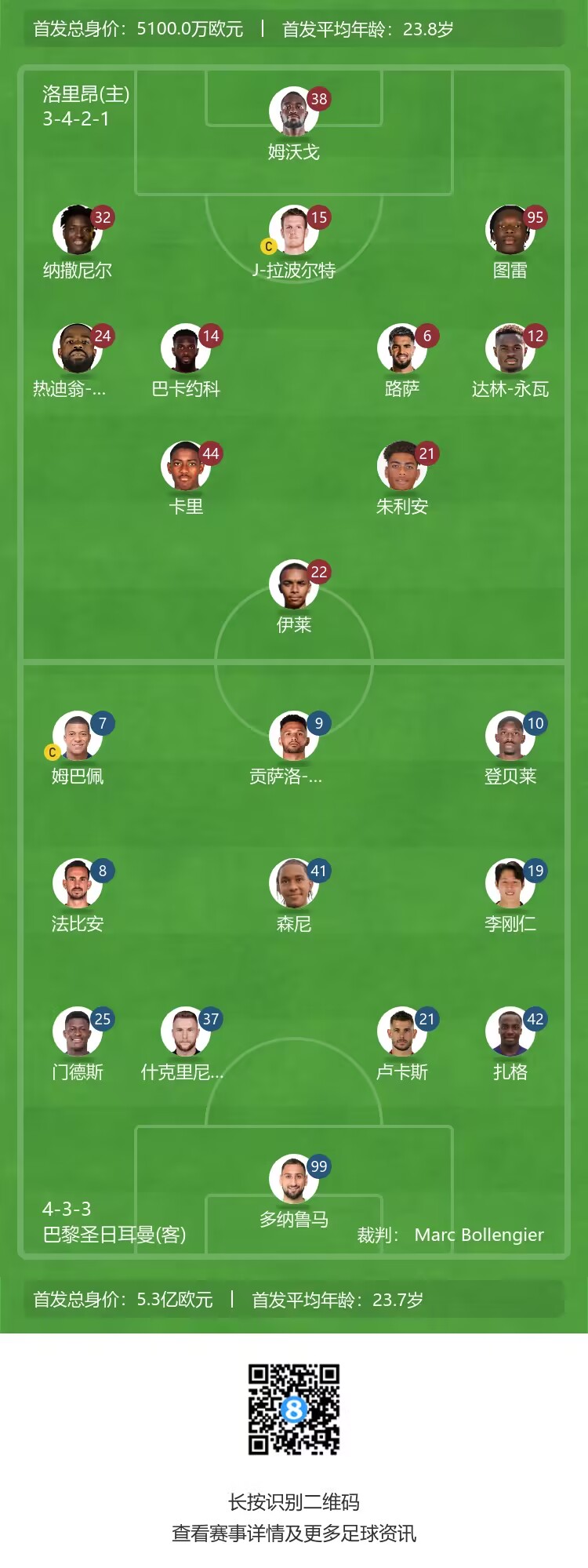 巴黎首發(fā):99-多納魯馬、42-扎格、21-盧卡斯-埃爾南德斯、37-什克里尼亞爾、25-努諾-門德斯、8-法比安、19-李剛?cè)省?1-馬尤盧、10-登貝勒、7-姆巴佩、9-貢薩洛-拉莫斯